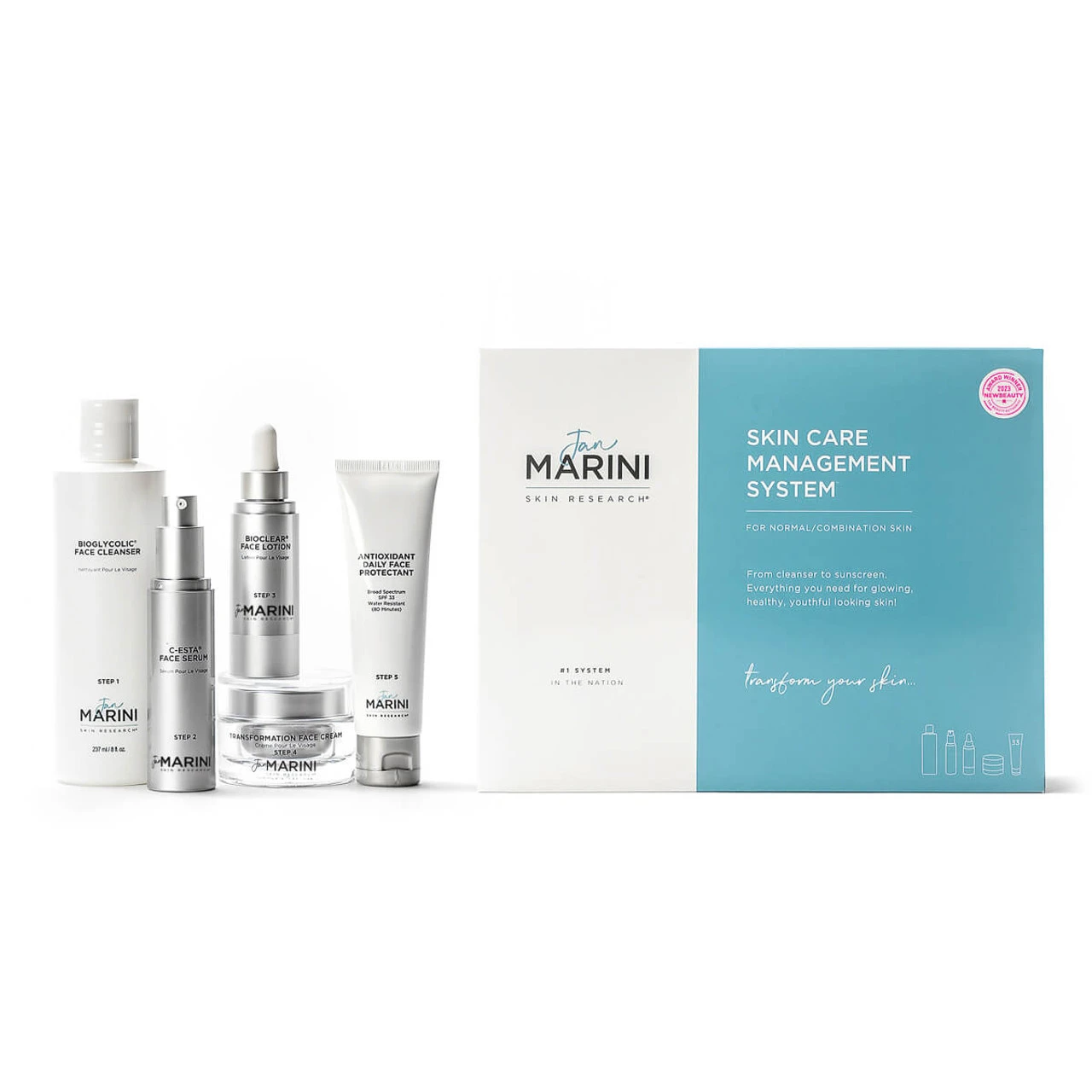 Experience dramatic transformation with the Jan Marini Skin Care Management System™ for Normal to Combination skin types for a complete skin care routine. See firsthand why it’s the most awarded product by NewBeauty Magazine and 2023’s Best System!