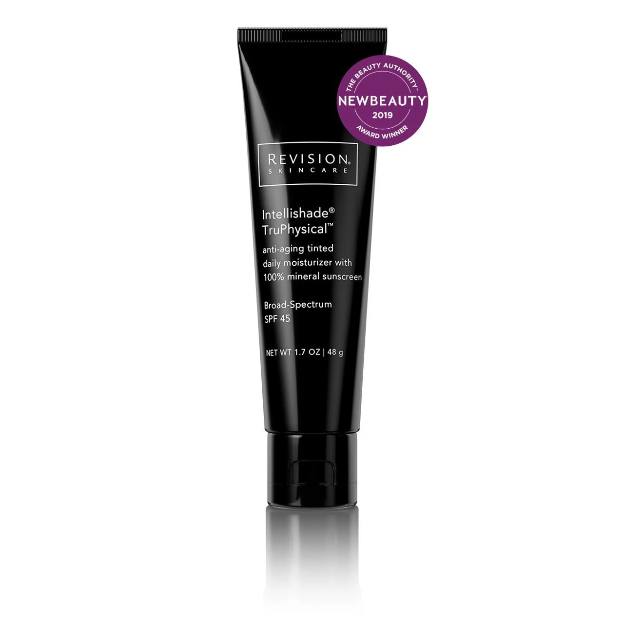 Intellishade TruPhysical from Revision is an award-winning, first-of-its-kind moisturizer with 100% all‐mineral broad‐spectrum sunscreen formulated without hidden chemical sunscreens, parabens, alcohol and artificial fragrances. This anti-aging daily moisturizer is intelligently designed to deliver the power of 5 anti-aging products in 1. Helps to correct, protect, conceal, brighten and hydrate skin to deliver clinically-proven results. This 5-in-1 moisturizer features over 20 age-defying ingredients, broad-spectrum SPF 45 protection plus a universal tint for an instant glow.